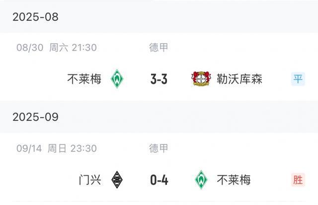 不莱梅德甲前三轮1胜1平1负,目前积4分位列德甲第9。