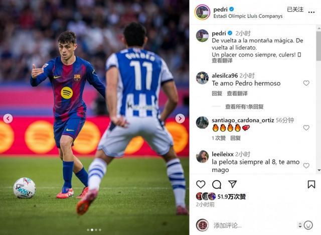 全场最佳!佩德里社媒:重返西甲榜首,快乐一如既往