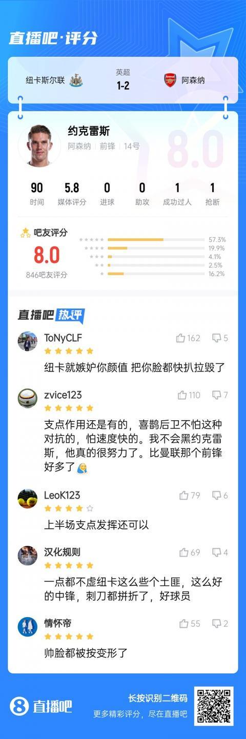 纽卡嫉妒你的颜值约克雷斯0球0助球迷评8分:支点作用明显