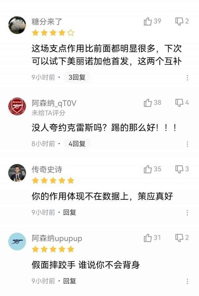 昨晚英超第6轮,阿森纳2-1绝杀纽卡,约克雷斯本场比赛首发打满全场,数据上并不出彩,媒体评分也仅有5.8分。但球迷为他打出了8分的高分,肯定了约克雷斯在场上的支点作用。