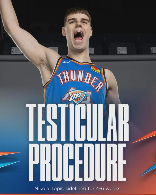 北京时间10月10日,NBA季前赛,雷霆vs黄蜂,雷霆后卫托皮奇因伤休战。托皮奇受伤的部位,出乎很多球迷的意料。雷霆官方宣布:托皮奇成功接受睾丸手术,4-6周后接受重新评估。至于托皮奇是如何受伤的,雷霆并未公布。