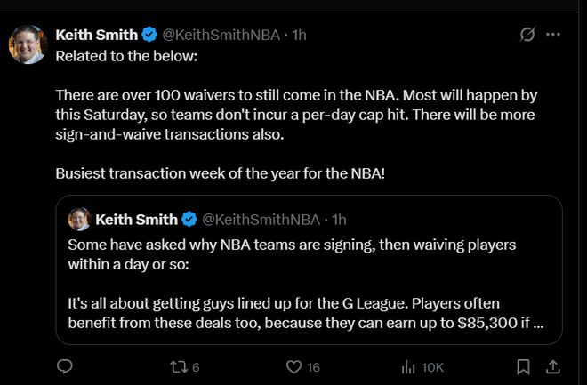 雷速体育10月14日讯 名记Keith Smith更新社交媒体,谈到了为什么NBA球队会在签下球员后一天裁掉他们,并提到了本周将会是NBA最繁忙的交易周,一些非保障合同的球员能否留在球队很快就能得到答案。此前,记者Ian Begley谈到了尼克斯的情况,他写道:“尼克斯队需要注意的是:周六是球队可以裁掉非保障合同球员且无需支付工资帽费用的最后一天。老将马尔科姆·布罗格登、兰德里·沙梅特和加里森·马修斯等都是尼克斯队非保障合同的老将。球队目前有1个空缺名额。”对此,名记Keith Smith点评到,“伊恩的这番话非常到位,也非常重要。尼克斯的利润空间非常小,即使多一天按比例计算的工资也会让事情变得复杂。上赛季他们很好地解决了这些小额利润问题,今年他们也会继续这样做。”随后Keith Smith继续更新社媒,以下为原文:“有人问,为什么NBA球队会在签约球员后一天左右就裁掉他们:这都是为了给发展联盟(G League)的球员们争取到名额。球员们通常也能从这些合同中获益,因为如果他们在发展联盟的附属球队效力60天,就能赚到高达85,300美元的薪水。NBA仍有超过100名球员需要豁免。大多数豁免将在本周六完成,这样球队就不会每天承担薪资空间的负担。此外,还会有更多先签后弃的交易。这将是NBA一年中最繁忙的交易周!”截止到目前为止,距离NBA新赛季正式开始的时间越来越近,一些非保障合同的球员能否留在球队很快就能迎来答案,中国球迷目前非常关注的曾凡博就是其中之一。