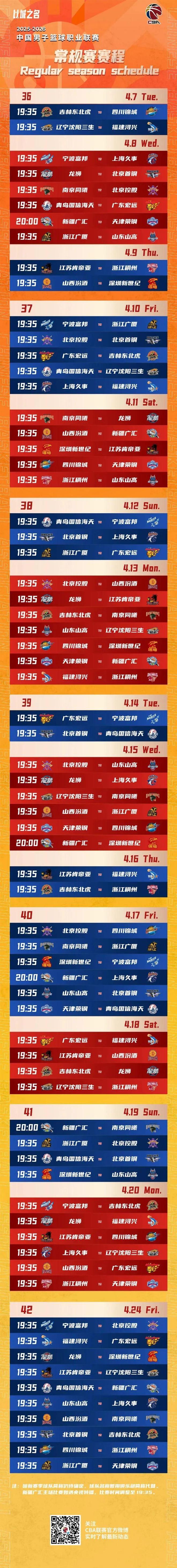 10月20日,CBA联赛公布新赛季赛程,2025-2026赛季CBA联赛常规赛将于12月12日开赛,次年4月24日收官,常规赛共42轮。其中在12月13日,新疆男篮将在主场迎来首场比赛,对手是福建男篮。2026年4月24日,新疆男篮将在最后一轮比赛中将对阵青岛男篮。