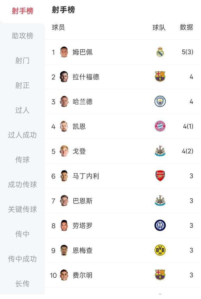 本赛季欧冠射手榜:姆巴佩5球居首,拉师傅&哈兰德4球紧随