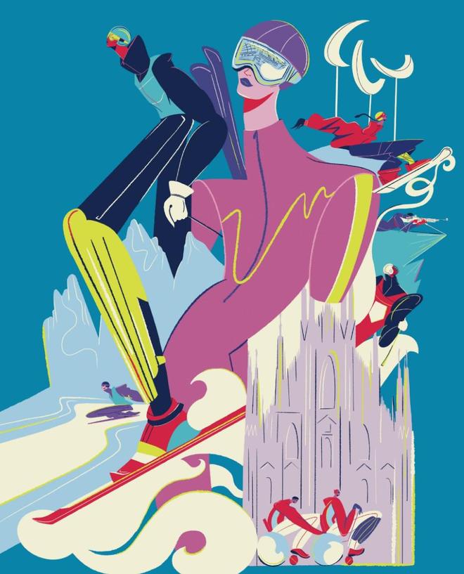 Zagnoli创作了色彩鲜艳的“奥运愿景”海报,海报中央的人物透过奥运五环造型的眼镜,以白色山峰为背景,凝视着前方。Zagnoli表示,她的海报既捕捉了家乡米兰的时尚感,也体现了科尔蒂纳的山地风情,同时也歌颂了观众和运动员。