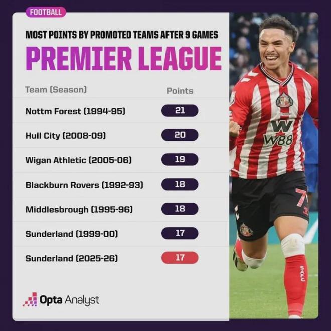 赛后据统计,桑德兰本赛季前9轮联赛战绩,也能能够排在英超联赛第6的。数据统计显示,他们在英超历史升班马中都位列前茅。