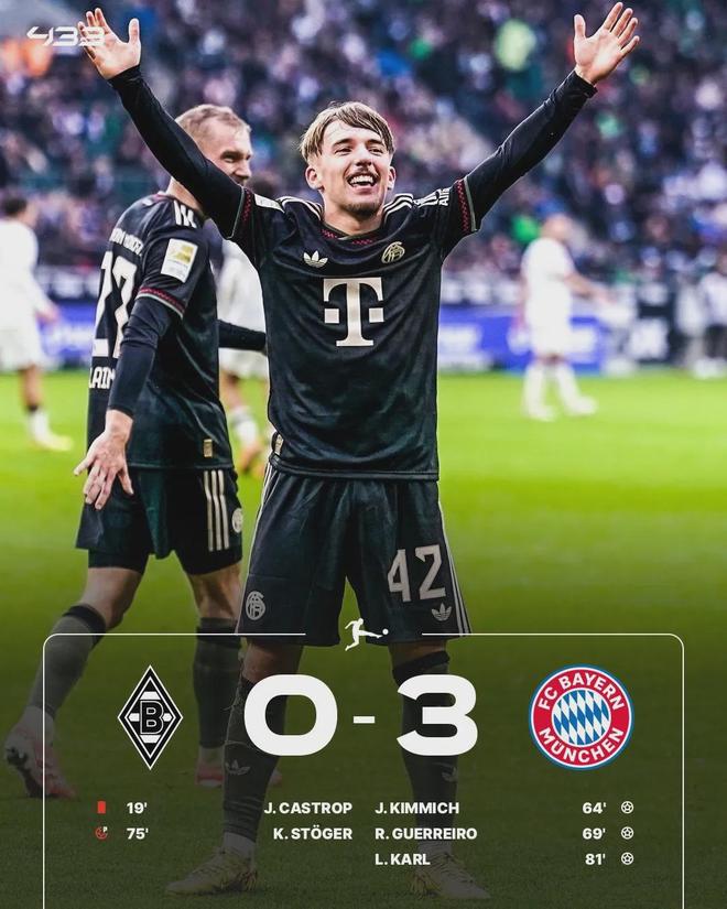 不过,比赛的进球却是等到下半场才到,基米希打破僵局,随后格雷罗进球,第81分钟,17岁卡尔替补登场,打进一记世界波锁定胜局!