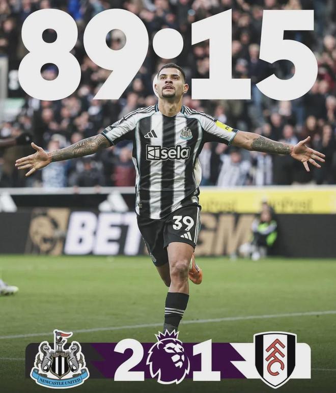 英超第9轮,纽卡坐镇主场对阵富勒姆,墨菲率先为纽卡打破僵局。随后,萨萨-卢基奇为富勒姆扳平比分,双方一度陷入胶着。第90分钟,吉马良斯挺身而出,打进绝杀球,纽卡在主场最终2-1击败富勒姆。
