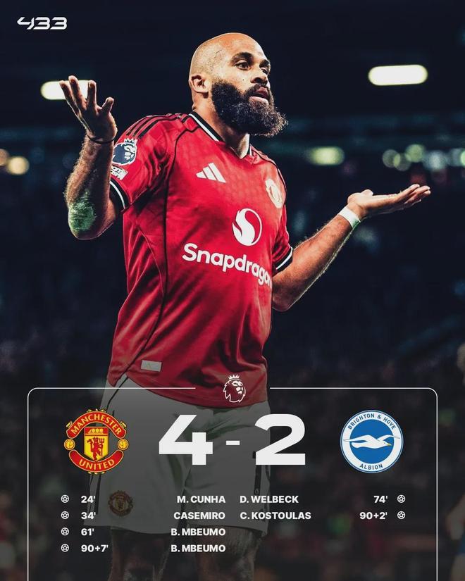 下半场,姆伯莫上演梅开二度,尽管布莱顿凭借维尔贝克的任意球直接破门,以及科斯图拉斯头球破门,但他们还是在客场2-4不敌曼联。