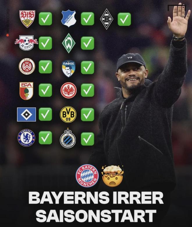 在德甲豪取8连胜,不仅如此,拜仁进入25-26赛季之后,开季连胜场次来到13场!