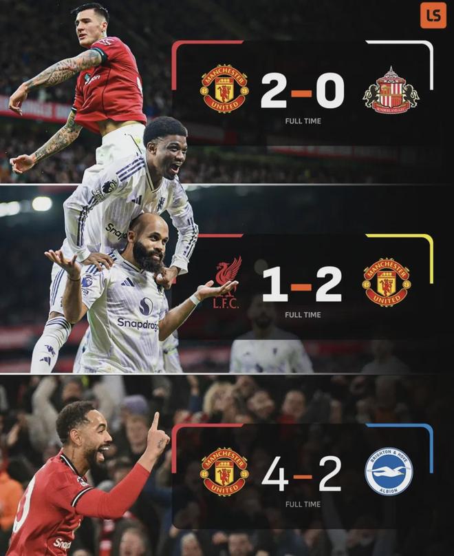 同时,这是曼联自2023年8月以来,首次取得英超主场四连胜。