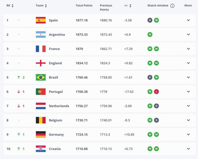 北京时间11月19日,FIFA公布最新世界排名,西班牙队排名第一,阿根廷排名第二,法国排名第三。中国仍居第93位。西阿法英巴葡荷比德锁定世界杯种子队。