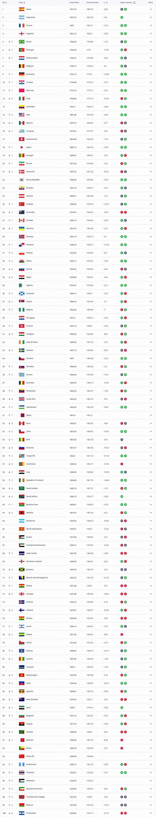 FIFA最新世界排名:西阿法英巴葡荷比德锁定世界杯种子队中国仍居第93