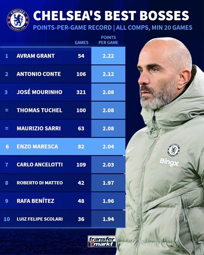 - 英超 | 82战场均2.04分,马雷斯卡超越安帅升至切尔西队史主帅第6位
