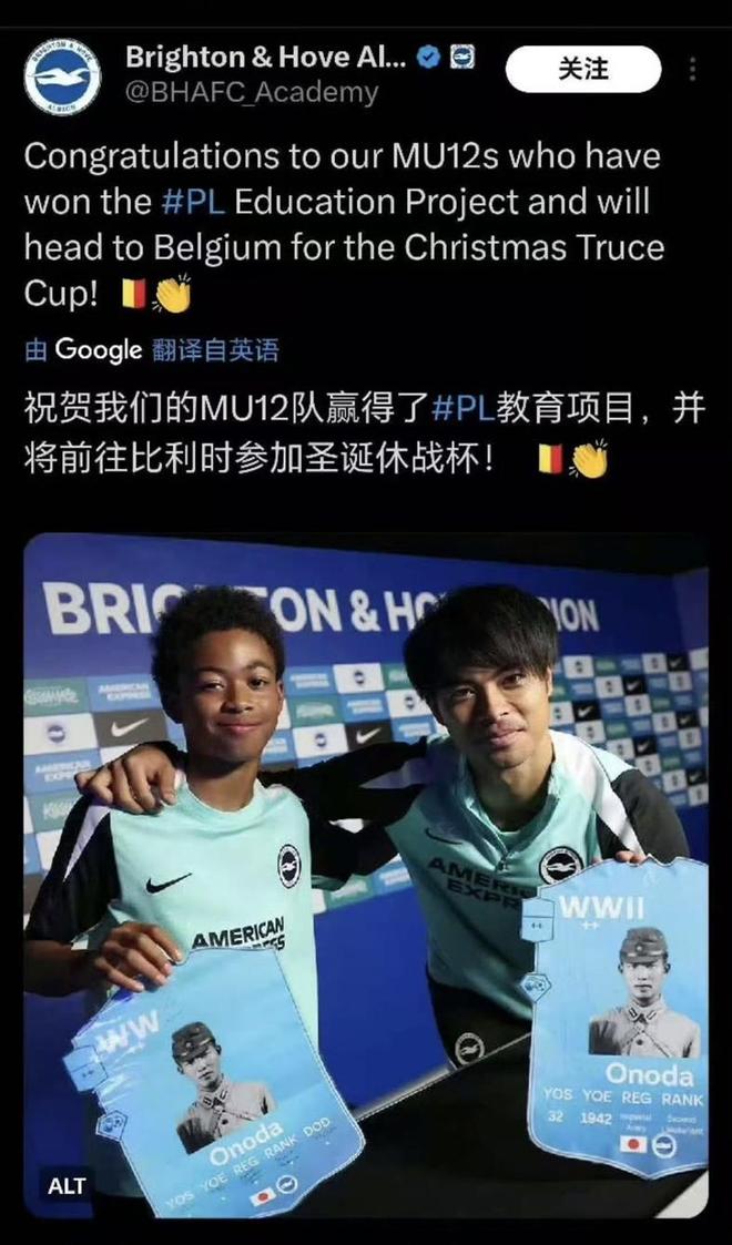 日前,布莱顿青训学院官方账号发布了一张照片,引爆全球,不单局限于足坛了:照片中,布莱顿足球俱乐部一线队日本籍球员三笘薰与一名小球员合影,二人手持类似球员卡的卡片。卡片上并不是球员头像,而是一个日本军人。经查,该日本军人名叫小野田宽郎,是第二次世界大战时的日本陆军少尉。
