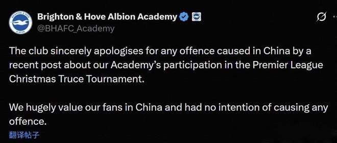 包括众多中国球迷在内的很多热爱和平的人,对布莱顿足球俱乐部进行了严厉指责。布莱顿青训学院账号删除该贴,并于11月29日发布道歉声明,就发布的关于青训学院参加英超圣诞休战活动的帖子在中国造成的任何冒犯,深表歉意。“我们非常重视在中国的球迷,绝无冒犯之意。”但该道歉帖被限制了评论。
