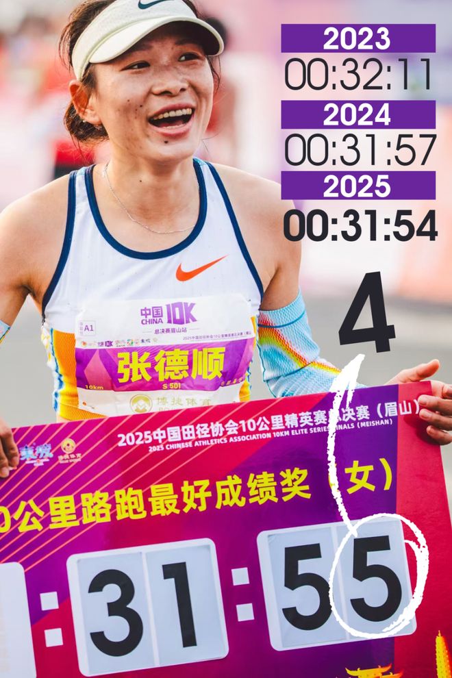 眉山,是中国路跑的纪录之地。在过去两年,眉山仁寿见证了中国国家半马男女最好成绩的诞生。而在2025年年末,张德顺在眉山举办的中国10K总决赛上将自己保持的10公里最好成绩刷新到31:54,比2024年在安徽芜湖创造的31:57快了3秒。